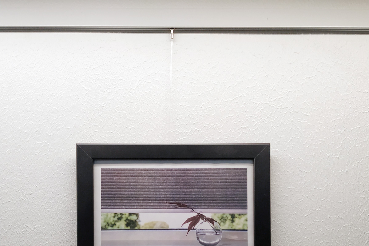 - Helppo asennus: Kisko kiinnitetään seinän yläosaan, ja taulut ripustetaan kiskoon koukkujen ja lankojen avulla.